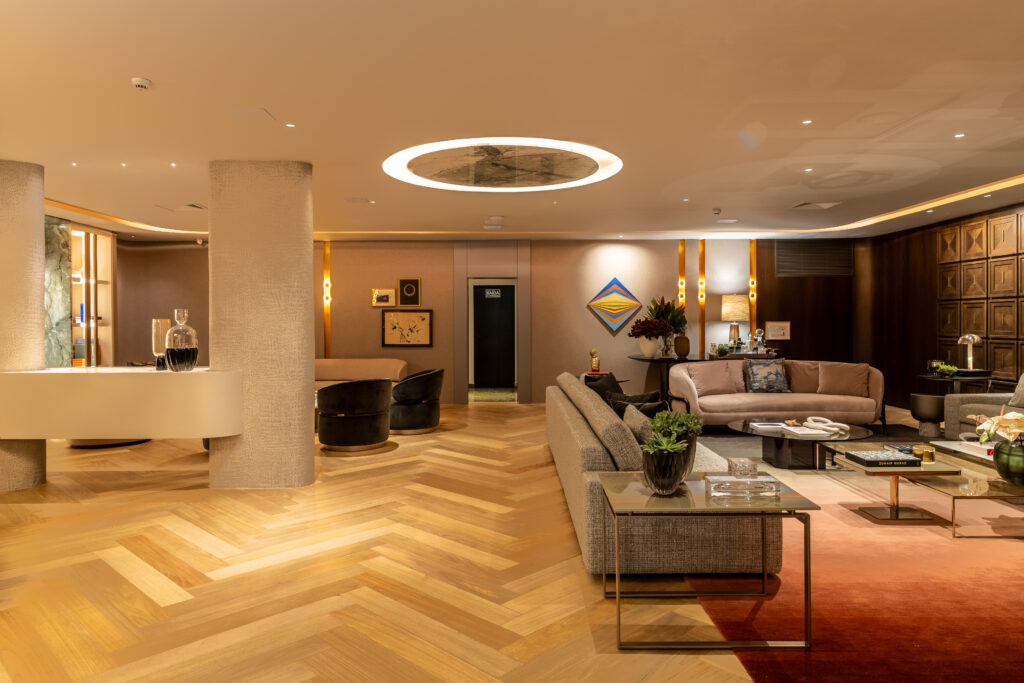 O projeto é composto por um generoso living, em um dos lados, e, do outro, há os espaços de jantar, bar e lounge de estar – tudo junto responde pelos 110m² dedicados ao conforto e bem-estar. Com layout dinâmico e fluido, a sala de jantar mistura cadeiras e mesa de design moderno em contraponto ao icônico lustre de cristais de rocha, que relembra as décadas 1960 e 1970. Logo após os dois pilares, com a função de biombos que ancoraram o bar, formado pelo aparador com tampo de pedra retroiluminada, Patricia propôs um lounge circular mais intimista. Com uma estante metálica de nichos iluminados ao fundo, essa área fica envolvida por sofás e poltronas curvas que abraçam quem chega, delicadamente abraçados pelo tapete redondo. “Totalmente integrados, os ambientes apresentam elementos clássicos e atemporais que refletem bom gosto e longevidade”, revela a profissional que optou também por uma iluminação indireta e mais intimista como estratégia para entregar a atmosfera de acolhimento em todo o espaço.